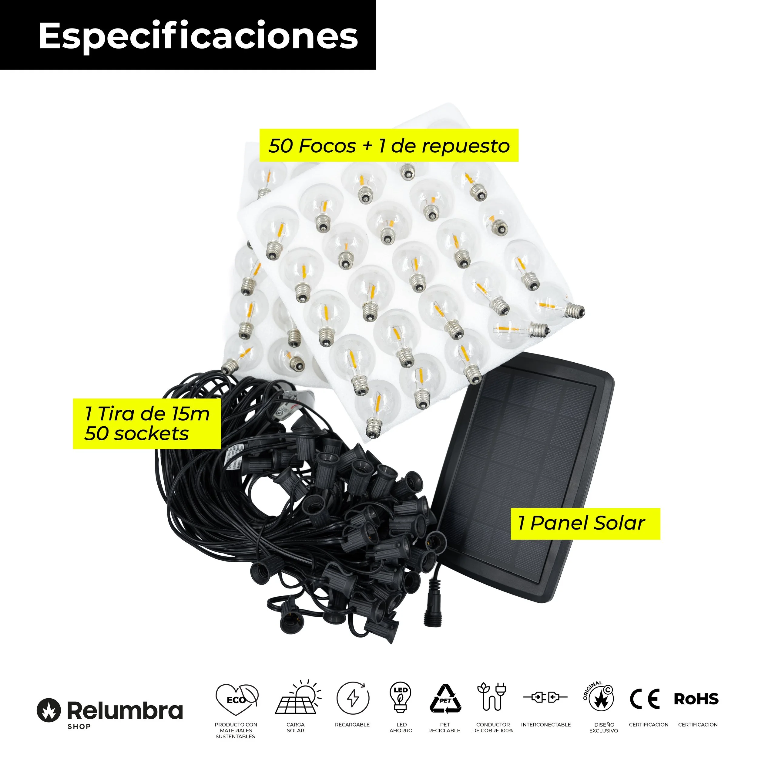 ILUMINACIÓN SUSTENTABLE DE ALTA CALIDAD. Nuestras líneas de luces bulbo de 15 metros no solo destacan por su diseño elegante y funcional, sino por su compromiso con el medio ambiente. Utilizamos cobre de alta conductividad que mejora la eficiencia energética y prolonga la vida útil del sistema. Como cobertura, empleamos PET reciclable, un material resistente, flexible y amigable con el entorno. Cada foco es LED de bajo consumo, lo que reduce significativamente el gasto energético sin sacrificar brillo ni calidez.